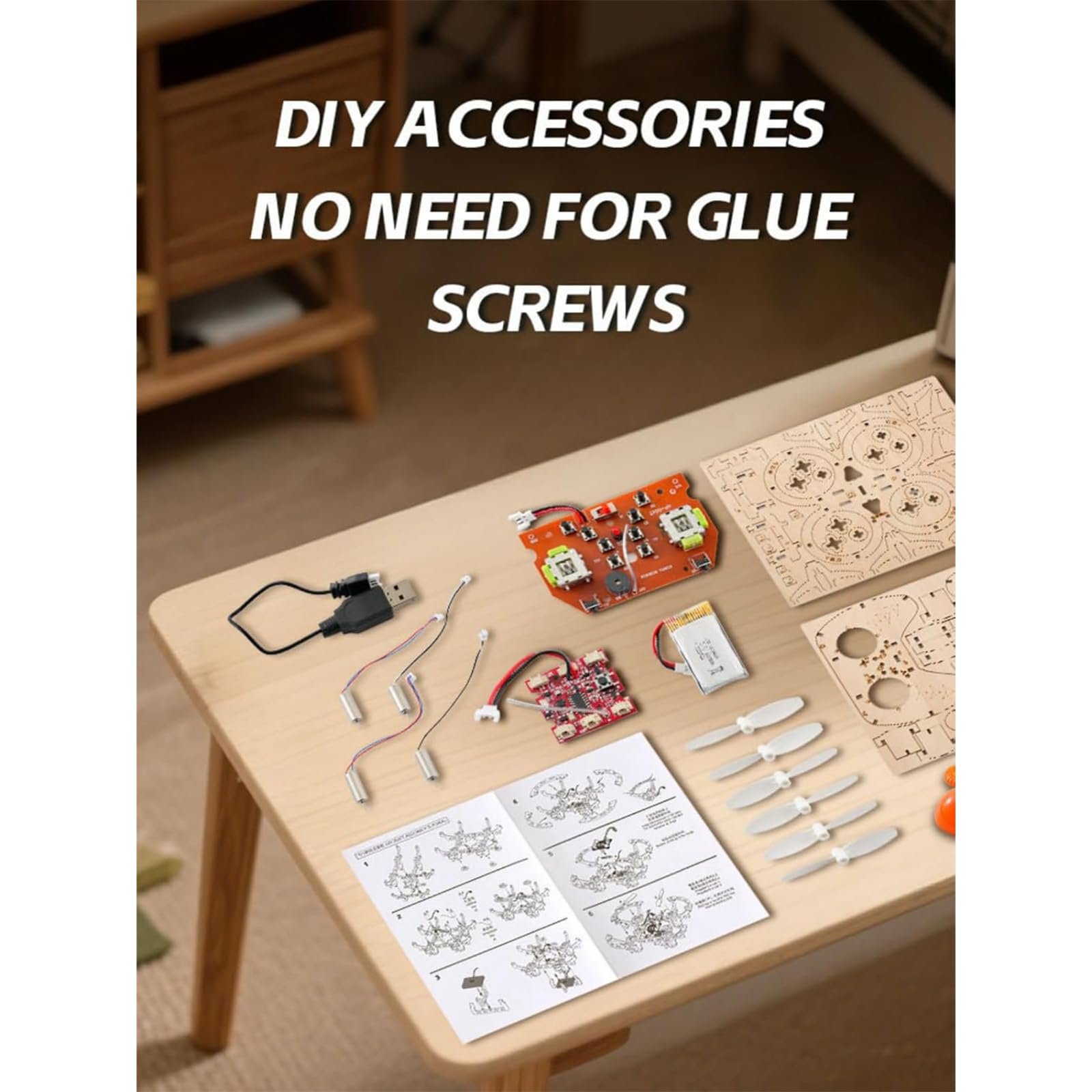 Every part is included for you to build a real flying quadcopter from scratch. The kit features precision laser-cut wooden panels, electronic components, propellers, motors, battery, USB charging cable, and a detailed step-by-step instruction manual. No glue or screws required—interlocking parts fit together seamlessly for a clean, frustration-free build.